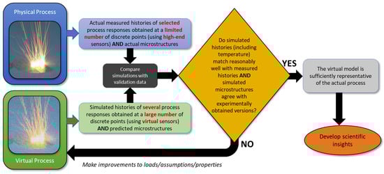 Against this backdrop, physics-based computational modelling is uniquely positioned to help bridge part of the knowledge gap. For instance, simulations can reconstruct the physical processes by combining known inputs (e.g., rate of heat input, estimated heat loss to the ambient) and predict responses (e.g., temperature evolution) of AM systems by solving the associated governing equations (e.g., Fourier heat conduction). A correctly reconstructed (i.e., experimentally validated) virtual replica of an AM process allows the researchers to ‘see’ the actual process by interrogating ‘virtual probes’ for various response histories (e.g., temperature, displacement). Unlike the limited number of high-end physical sensors that may be used in the experiments, there can be a multitude of virtual sensors providing an unparalleled ‘view’ of the process. For example, any node in an FEA analysis can be used to obtain histories of the field variables. In addition, the analyst can ‘freeze’ the process at critical junctures for in-depth studies of events leading to an undesirable event.
