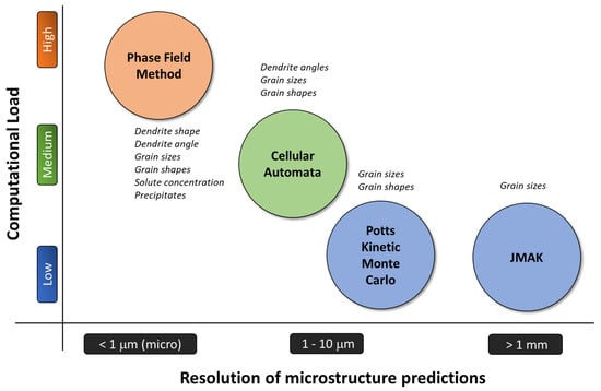 Several numerical methods are capable of simulating microstructures in AM at the required level of resolution, i.e., at the mesoscopic scale (that spans from nanometres to micrometres) and at the continuum scale. Some examples of these are front-tracking [], phase field (PF) [,,,,], level set (LS) [], lattice Boltzmann (LB) [,], Potts kinetic Monte Carlo (kMC) [,,,], cellular automata [,,,] and the Johnson–Mehl–Avrami–Kolmogorov (JMAK) theory-based phenomenological model [,]. These varied techniques have unique strengths and weaknesses [,,] which means modellers can select the method best suited to their tasks based on these considerations. For example, by deliberating the resolution vs. computational load relationship (Figure 5), a decision may be made on how much accuracy may be sacrificed to obtain a faster solution. Additionally, some methods (e.g., PF) are better suited to considering fundamental physics and may thus be the optimum choice for tailoring microstructures. Each technique also has its own set of unique challenges that modellers need to address—especially when simulating a highly nonequilibrium process such as AM. The hurdles faced by modellers are considered later, in Section 6. While we do not consider atomistic or molecular dynamics simulations here, these may be used to obtain some inputs required for the above methods using first principles.