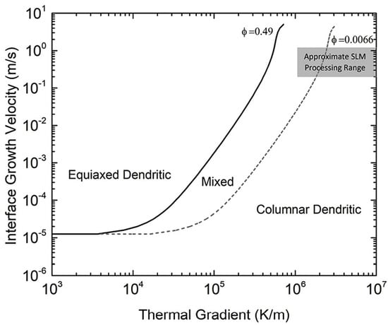Temperature histories recorded during AM builds capture the combined influences of heat sources and sinks and provide crucial information on local solidification rates. Specifically, they help quantify the local temperature gradient G and the solid–liquid interface velocity R (i.e., the rate at which the liquidus isotherm moves). The balance between G and R plays an important role in determining the morphology of the microstructures in AM processes such as Direct Energy Deposition (DED) [], Wire Arc Additive Manufacturing (WAAM) [], Laser Powder Bed Fusion (L-PBF) [,], and Electron Beam Powder Bed [,]. One such relationship for an L-PBF process is shown in Figure 6.