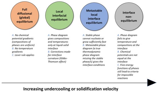 It is known that a certain amount of undercooling (curvature, thermal, constitutional, pressure or kinetic) is necessary for solidification to occur since there is no driving force under equilibrium conditions []. As the degree of undercooling grows, the velocity of the solid–liquid interface (which is related to the rate of solidification) increases. This departure from equilibrium gives rise to a well-defined ‘equilibrium hierarchy’ (Figure 8).