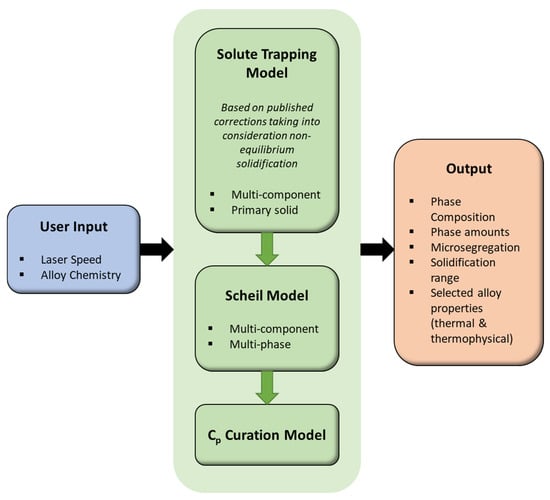 A computational framework [] for predicting microsegregation in AM. It uses previously published modifications made to the Scheil model that account for solute trapping. The ‘Cp curation model’ refers to the calculation of specific heat as a function of chemistry and temperature using the Thermo-Calc software. The figure is adapted from that work.