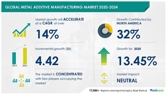 - Metal Additive Manufacturing Market to Record an Incremental Growth of USD 4.42 Billion. 2021. Available online: https://www.prnewswire.com/news-releases/metal-additive-manufacturing-market-to-record-an-incremental-growth-of-usd-4-42-billiontechnavio-301275507.html (accessed on 30 August 2021).