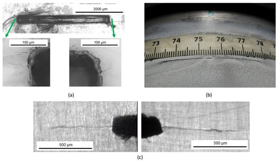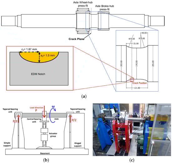 The adopted full-scale axle specimens are shown in Figure 1. The axles were designed to be tested under the three-point bending bench with 250 kN load capacity (Figure 1b,c), available at both Politecnico di Milano and Lucchini Rs R&D laboratories. The axles were made of 25CrMo4 (EA4T) steel according to the European standard BS EN 13261 [], and they were quenched and tempered with the tensile properties shown in Table 1. Note that the tensile specimens were machined according to the EN 13261 standard from different locations of the axle. Two hubs representing the wheel and the brake were press-fitted to the axle with contact pressures similar to the actual full-scale components. Semi-elliptical artificial defects with initial depth a = 1.5 mm and aspect ratio = 0.8 were introduced by electrical discharge machining (EDM), being c the superficial crack length. The semi-elliptical shape is dictated by the type of damage that is typically promoted by the impact of foreign objects, as shown and discussed also in the literature [,,]. The dimensions, instead, are determined by the minimum detectable defect size of the employed non-destructive methodology [] together with the statistics obtained in the RSSB T728 project [].