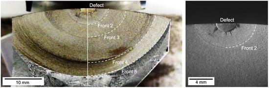 Following the full-scale tests, the axles were cut and broken to analyze the fracture surfaces. As an example, Figure 4 shows the fracture surface of the S064 axle. During crack propagation, the crack depth to surface length ratio varies, but the basic shape remains semi-elliptical, as also observed in other experiments on railway axles [,]. As the crack growth during the tests was measured on the surface, the beach marks in the fracture surface were reconstructed using ellipses to assess the crack shape and subsequent crack depth a.