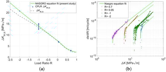 Fatigue crack growth characterization of the present EA4T steel: (a) Evaluated R-dependence of long crack thresholds (values acquired from []) and comparison with the available data in literature [] and (b) crack growth curves and interpolation with the Nasgro equation.
