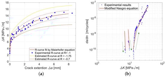 The trend of the against the stress ratio is reported in Figure 5a. Figure 5b shows the obtained experimental crack growth data for the load ratios R = −2, −1, 0.05, 0.7. The experimental cyclic R-curve at the load ratio R = −1 is illustrated in Figure 6a. The R-curve shows a steep increase in the threshold up to crack extension of 1 mm, then it gradually increases up to 3 mm and reaches asymptotic values. The fitting of the cyclic R-curve will be presented in Section 4.2.