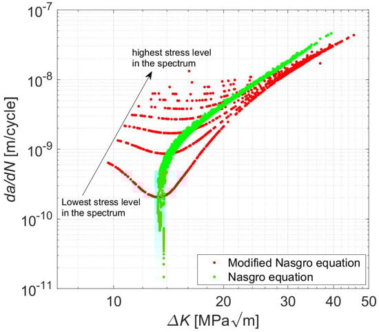 In terms of comparison between the algorithms, the simulations performed with the Modified Nasgro equation are in good agreement with the experimental results. Even if they are slightly conservative (maximum underestimation 30%), it is clear that the Modified Nasgro equation produces predictions with a curvature very close to the experimental results. Remarkably, the predictions are very precise under load spectra with low stresses (Figure 9c,d) that are the ones closer to the real service conditions. By contrast, it is evident that the adoption of the conventional Nasgro equation generally leads to a significant overestimation of the propagation lifetime of the order of 120% (see Section 6.2 for an explanation of this effect).