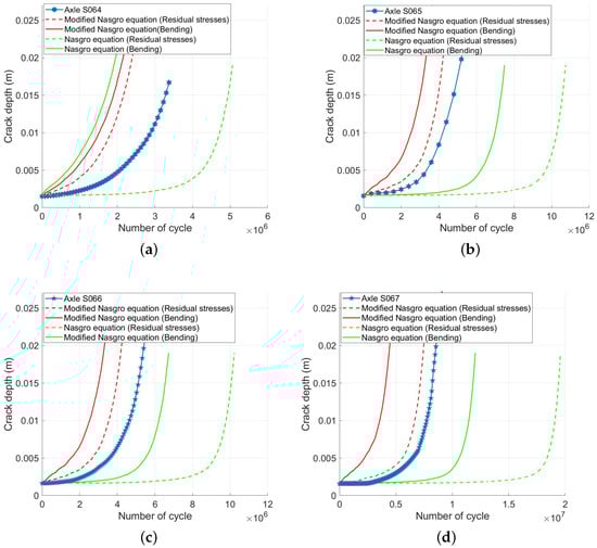 The residual lifetime predictions for each axle are presented in Figure 9 and Table 4. The experimental data are reported with blue dots, while the predictions performed with the Nasgro equation and the Modified Nasgro equation are indicated, respectively, with the green and red colors. In addition, the solid lines indicate the predictions performed considering only the rotating bending stresses, while the dashed lines indicate the predictions considering the superposition of rotating bending stresses and residual stresses.