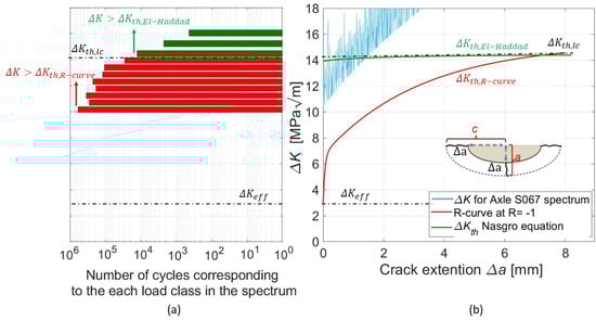 Comparison of the condition according to the Nasgro equation and Modified Nasgro equation (R-curve) for a initial crack size of and mm with a crack extension ahead of the notch (Axle S067): (a) levels and corresponding number of cycles in the spectrum and (b) The calculated driving forces in the surface point of the crack plotted against the threshold condition adopted in Modified nasgro equation and Nasgro equation (El-hadad correction for short cracks).