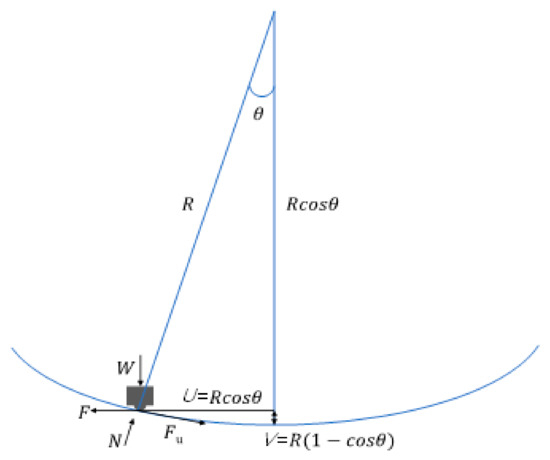The FPS, a seismic isolator of the friction series, is a device that can determine the natural frequency of the target structure by using the characteristics of the pendulum. As shown in Figure 1, it moves like a pendulum along a horizontal direction on a curved surface to show the effect of seismic isolation based on the dissipation of seismic energy. The horizontal direction force (F) of the FPS can be expressed as