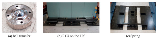 The existing FPS can cause a separation of the ball and impact due to uplift induced by vertical vibration, and can cause overturning of the cabinet equipment due to unstable conditions. The seismic isolator, used as a type of FPS in this study, is a non-overturn seismic isolator manufactured by Power&Tech Co., Ltd, Seongnam-si, Korea. To prevent the separation of the ball, a ball transfer, as shown in Figure 2a, was installed, and the spring connecting the upper and lower plates of the seismic isolator system ensures horizontal and vertical restoring forces, as shown in Figure 2b. Figure 2c illustrates the system with a spring as a type of FPS.