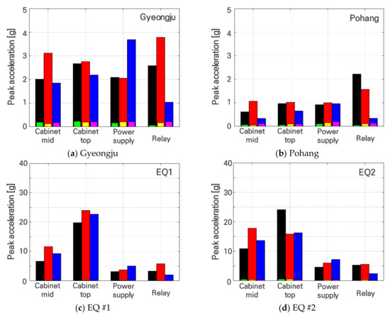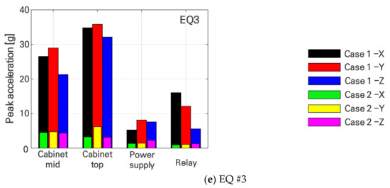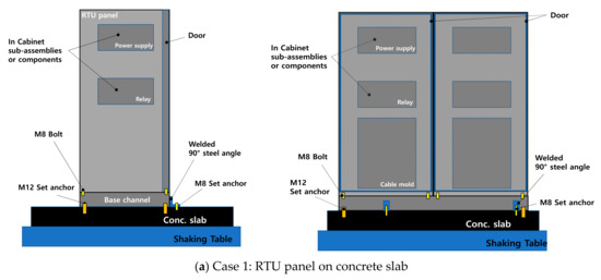 - For Case 1, wherein the RTU panel was fixed to the concrete foundation using a set anchor, the peak acceleration response of the internal components’ power supply and relay was greater than that of other locations for the recorded earthquake test. In contrast, during the artificial earthquake tests, the peak acceleration response measured at the top of the panel enclosure was the highest.