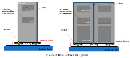 A remote terminal unit (RTU) is a device that collects data from remote locations and transmits them to a higher-level target system. In addition, the RTU, an important device in power plants, can perform the procedure to control the power generation facility from the received data. Therefore, this study selected a group of existing RTU systems in a hydroelectric power plant and then conducted a tri-axis shaking table test to obtain reliable test results. Table 1 presents the details of the targeted RTU panel and seismic isolator. Regarding the existing RTU panel, the mass of the grouped cabinet system is illustrated, and the mass of the seismic isolator devices include a jig to fix the shaking table.