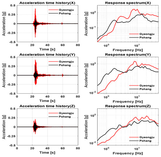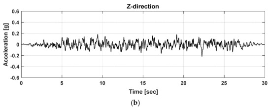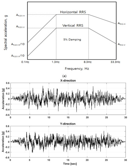The acceleration time history was implemented using a trapezoidal envelope function in accordance with ASCE 4-98 [33], and the correlation of each axial direction (x, y, z) was examined. The coefficient of correlation function at xy, xz, and yz planes was set as 0.3 or less, based on ASCE 4-98 and IEEE Std. 344 [34]. The duration of the acceleration time history with respect to the artificial ground motion was 30 s and, in this case, the duration of the strong ground motion was 20 s. Furthermore, with this acceleration, the magnitude of the acceleration increased for the first 5 s, and then the strong ground motion continued for 20 s. Subsequently, the magnitude of acceleration decreased during the last 5 s.