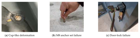 After the shaking table tests, the power was turned on–off–on to confirm the functionality of the RTU system, and then a visual inspection was conducted to examine the parts for drop-off, deformation, and loosening of bolts. Figure 7 and Table 8 present the visual inspection results. For Case 1, the cable mold was disconnected during the Pohang earthquake, but there was no damage by visual inspection during the Gyeongju and Pohang earthquakes for Case 2. In the case of the seismic simulation test by an artificial earthquake, the cable mold was also uncoupled during Test 6 (EQ #2), and the fixed door device was damaged in Test 7 (EQ #3). Therefore, the door was opened during the test, and the test was terminated. After the shaking table tests, a cup-like deformation occurred around the bolt connection area of the lower plate at the RTU panel, and the M8 anchor set was also damaged, as shown in Figure 8.