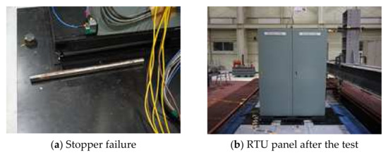 The RTU system with the seismically isolated device, however, remained functional and operational during and after the EQ #3 (test 7) loading condition for Case 2. There was also no structural damage during EQ #4 (test 8), but the test was stopped because the fall prevention stopper of the seismic isolator was split, as illustrated in Figure 9. The fall prevention stopper was damaged by the impact generated by the friction pendulum, exceeding the allowable displacement caused by the seismic ground motion. Therefore, the allowable displacement of the slider plate of the friction pendulum system could be adjusted to sufficiently respond to the strong ground motion. Accordingly, we assumed that the uncertainty with respect to other structural damage in the RTU system could be reduced by concentrating the damage mode to the seismic isolators. Notably, the integrity of the electric circuit was maintained until all the seismic simulation tests were completed.