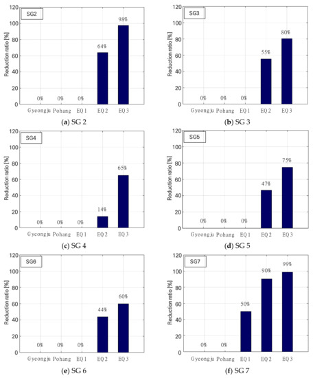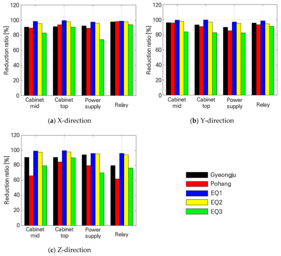 To evaluate the effect of the seismic motion reduction by the seismic isolator, the peak acceleration responses of both the cases were compared, as shown in Figure 12. Figure 12a,b show the peak accelerations related to both the recorded earthquakes. In addition, the peak accelerations corresponding to the artificial earthquakes are illustrated in Figure 12c–e. For Case 1, wherein the base channel is fixed to the concrete foundation with post-installed anchors, in the case of the Gyeongju earthquake (Figure 12a), the peak acceleration response of the internal component power supply and relay was greater than that of the other locations. In particular, the peak acceleration response was 3.78 g, which is the largest in the relay. In addition, for the case of the Pohang earthquake (Figure 12b), the peak acceleration response was 2.22 g at the relay. In the case of the artificial earthquake in Figure 12c–e, the peak acceleration responses were also measured at the top of the panel’s enclosure, which were 23.96 g, 24.14 g, and 35.81 g for EQ #1, #2, and #3, respectively. The peak acceleration response measured by the internal power supply and relay was also greater than 5 g for Case 1. In Case 2 of the RTU panel installed with non-overturn seismic isolator, however, the peak acceleration response in the Gyeongju earthquake, Pohang earthquake, and EQ #1 was approximately 0.2 g; the peak acceleration response up to EQ #2, the seismic design level, was less than 0.5 g. Even in EQ #3, the magnitude of the peak acceleration response was quite small compared to Case 1. Figure 13 showed the reduction ratio of the peak acceleration response of Case 1 and Case 2 by Equation (12). Here, amax is peak acceleration of each case. Except for EQ #3, the peak acceleration response of Case 2 in the horizontal direction was at least 85.3%, and up to 99.6% smaller than that of Case 1. In the vertical direction, except for the Pohang earthquake and EQ #3, the peak accelerations measured in Case 2 were approximately 79.7%–99.7% less than those of Case 1. Therefore, the non-overturn seismic isolator applied in this study can effectively control the vibration amplification of the structures during triaxial simultaneous input ground motions. The peak acceleration ratio in the vertical direction, however, was less than that in the horizontal direction.