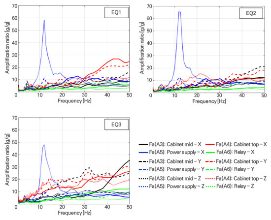 - In both cases 1 and 2, the acceleration in the vertical direction of the power supply was significantly amplified, and the amplification ratio (Fa) value of Case 1 rapidly increased in the frequency range above 30 Hz. Furthermore, the vibration of the device, shaking of the door, and uplifting in the high-frequency content affected the amplification ratio of the responses considerably.