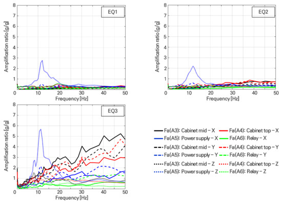 Figure 14 and Figure 15 demonstrate Fa(i) for each measurement location for case 1, and 2, respectively. In both cases, the amplification in the vertical direction of the power supply was the largest; in addition, Fa of the power supply for Case 1 was 65. However, for Case 2, the amplification ratio was efficiently controlled to 6 or less. For Case 1, in all earthquakes, excluding the Pohang earthquake, Fa tended to increase rapidly in the frequency region above 30 Hz. The amplification ratio of the response may appear large in the high-frequency region owing to the vibration of the device, thumping of the door, and the impact caused by uplifting [12]. In addition, for Case 2, the peak Fa value up to the EQ #2 test was maintained to less than 1 in both the horizontal and vertical directions. In the EQ #3 test, Fa increased from the RTU panel’s enclosure toward the high-frequency range. Notably, the ball and slider plate collided with the allowable limit displacement of the seismic isolator. Compared with Case 1, the value for Case 2 was less than 1/7. Table 11 lists the Fa values corresponding to zero period acceleration (ZPA) associated with the maximum peak acceleration of the acceleration time history. ZPA is the acceleration level of the high-frequency, non-amplified portion of the response spectrum. This acceleration corresponds to the maximum (peak) acceleration of the time history used to derive the spectrum. In the IEEE std 693, which is the shaking table test method, the ZPA is assumed to be the acceleration at 33 Hz or greater [35]. In this study, because the input ground motion was identified within a range of 0–50 Hz, ZPA was considered to be 50 Hz. For Case 2, the peak Fa values up to EQ #2 were less than 1. In particular, the Fa of internal equipment to EQ #1 based on the building structure standards and EQ #2 related to the common application of seismic design standards was well controlled at 0.14–0.4. Figure 16 depicts the ratio of Fa for cases 1 and 2 in Table 11. As shown in Figure 13, except for EQ #3, the ratio of the peak acceleration response in Case 2 was 85% or more in both horizontal directions, and 75% or more in the vertical direction. Consequently, the non-overturn seismic isolator installed in this study effectively controls the amplification of seismic ground motion within the seismic demand range.