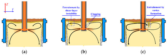 Schematic description of the hydrodynamic behavior inside the mold. (a) Double-roll symmetric behavior. (b) Low asymmetric behavior with slag entrainment by shear-layer instability. (c) Severe asymmetric behavior with slag entrainment by vortex formation.