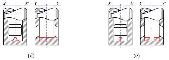 Along with operating conditions, geometric features of the submerged nozzle mainly define the hydrodynamic behavior inside the mold. The most studied SEN features include the number of outlet ports [8], the shape of the outlet ports [9], the tilt of the outlet ports [10,11], and the shape at the nozzle bottom zone [12]. Figure 2a–c show the most common bifurcated SEN bottom designs: a well-bottom, a flat-bottom, and a mountain-bottom nozzle. The outlet ports are rectangular in the nozzles presented in these figures. Notice that the primary difference among these three designs is a solid object attached to the inner bottom wall, highlighted with red lines in these figures. In the MB-nozzle, the upper part of the solid partially occupies the volume defined by the outlet ports’ inner planes. In this design, also notice that the solid upper edge is parallel to the outlet ports. Figure 2d,e show two specialized designs, where solid barriers are also attached to the inner bottom wall [13,14]. However, in these cases, the main axis of the solids is perpendicular to the nozzle outlet ports.