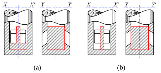 Previous numerical and experimental studies have shown that initially, symmetric flow develops two similar counterrotating vortexes at the SEN’s bottom. However, depending on the presence of SEN’s well and its depth, one of the vortexes shortly becomes dominant, suppressing the other [15,16,17,18]. This behavior, in turn, leads to the change of the flow pattern and thus the jet’s characteristics. Thus, finding a method to control the flow pattern inside the nozzle and the emerging jets motivates the current study. The proposed modification on the inner SEN geometry seeks the jets emerging from the nozzle to promote a symmetric hydrodynamic behavior inside the mold of a slab continuous casting machine. The SEN outlet jets must be symmetrical about a vertical plane located in the middle of the nozzle and parallel to the mold wide-walls. As in previous designs, the modification consists of introducing into the SEN a physical barrier perpendicular to the plane of the outlet ports. This barrier, named flow divider (FD), is attached to the SEN bottom wall. At this early stage of development, the FD consists of a rectangular brick. However, unlike previous designs, the FD’s height surpasses the upper edge of the nozzle outlet ports. The FD’s width is equal to the nozzle bore diameter, and the thickness should be as small as possible. Figure 3 shows a flat-bottom and a well-bottom nozzle modified with the flow divider. As in Figure 2, the fluid divider is highlighted with red lines. It must be pointed out that optimizing the FD thickness and total length is out of the scope of this work.