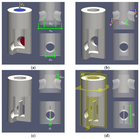 Dimensions and geometric characteristics of the nozzles studied in this work. (a) FB-nozzle. (b) WB-nozzle. (c) FBFD-nozzle. (d) WBFD-nozzle.