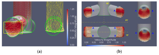 Hydrodynamic behavior inside a FB nozzle. (a) Fluid velocity vectors inside the nozzle. (b) Fluid velocity vectors as seen from the outlet ports. The letters A and B label the exit ports’ sides.
