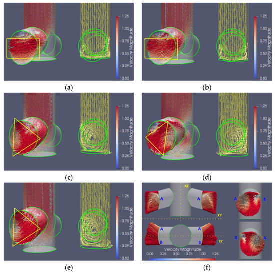 Notice that the rotation direction change of the dominant vortex from Figure 6c,d and later from Figure 6d,e. Furthermore, the vortex core for Figure 6c,e is in the left-hand half of the nozzle, whereas the vortex core is in the right-hand half of the nozzle for Figure 6d. Figure 6c–e reveal two low fluid velocity zones, but their locations depend on the vortex core location. These figures show that the highest fluid velocities are no longer concentrated in a horizontal strip near the middle of the port. Instead, the higher fluid velocities are distributed along an almost triangular region whose axis crosses the port center. A yellow triangle highlights this region. Notice that the triangle upper vertex deviates towards the same side as the core of the vortex. As a result, the shape of the nozzle outlet jets is asymmetric about the YZ axis. However, all the images in Figure 6f show that the patterns of the jets emerging at each of the nozzle outlet ports are vertical reflections from each other.