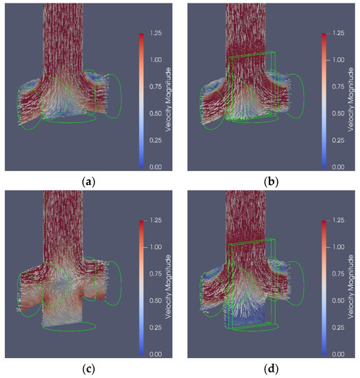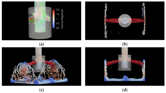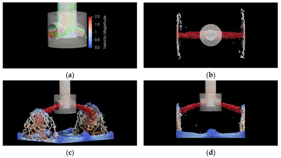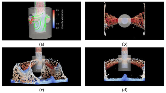 Finally, the same model but with a flow deflector, WBFD-20, is displayed in Figure 13. Again, the streamlines show that most of the flow is directed to the exit ports due to fluid cushions formed in both sections of the bottom-well (see Figure 13d). Similar to the case shown in Figure 11, the flow momentum is not lost in vortex formation but is channeled through the jets. Again, the jets are very narrow and parallel to the exit ports and do not touch their upper and lower parts.