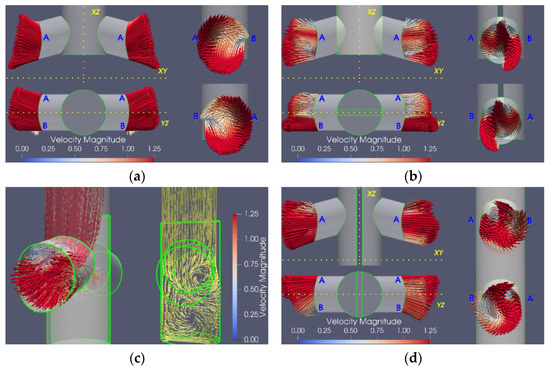 Hydrodynamic behavior of three particular systems. (a) Case I, FB-nozzle with inclined inflow. (b) Case II, FBFD-nozzle with inclined inflow. (c,d) Case III, a modified WB-nozzle with 20 mm of well depth and perpendicular flow dividers. The letters A and B label the exit ports’ sides.