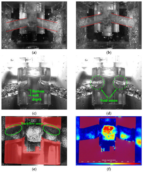 Figure 14e,f report the PIV experiments results for the WBFD-nozzle submerged in water inside the visualization cell. In order to analyze the influence that flow divider has on both exit ports, the entire span of the nozzle was studied. Particle tracers were seeded in the water. The hydraulic system was turned on, so water fills the cell. After one minute, the system reaches a stable operation. The high-speed camera also was used to record 2000 images for two seconds of the experiment. The laser sheet was shifted in front of the internal flow deflector to avoid reflections from it. The photographs were recorded and processed using the PIV infrastructure reported in [15,17]. The red-colored zone in Figure 14e,f indicates the masking region of the image, which was not processed by the PIV software. Figure 14e,f show the mean result of the processing of 116 pairs of images. In Figure 14e, the reconstructed fluid flow pattern is presented using white-colored vectors, scaled according their velocity magnitude. The velocity fields on the left and right-hand exit ports are not the same at this observation plane. This result could be explained as follows. The experimental tests shown in these figures used a laser light source directed from right to left. Therefore, the particles on the left side of the nozzle look less bright than the particles on the right side. From Figure 14e,f, it is possible to observe that the jet flow exits the nozzle using the lower half of the exit ports preferentially. Additionally, recirculation or backflow zones can be observed at the upper half of the exit ports. These results agree with the behavior obtained using CFD numerical simulations, as shown in Figure 9d.