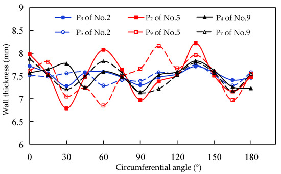 The maximum and minimum wall thickness are expressed as tm0 and tn0, respectively; the average wall thickness is expressed as t0, the difference between the tm0 and t0 is defined as the positive deviation Tm, the difference between the tn0 and t0 is defined as the negative deviation Tn and the difference between the tm0 and tn0 is defined as the initial wall thickness deviation T0. Ten tubes are randomly selected, and the wall thickness is measured by MT-160 ultrasonic thickness gauge. The measurement results of the half partial cross-section are shown in Figure 4, and the wall thickness distribution of the other half is symmetrical. The measurement results are as follows: