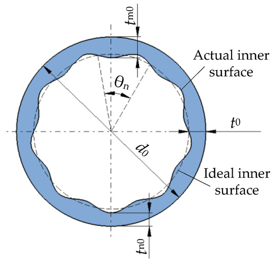 Based on the above assumptions, the geometric model of tube with wall thickness deviation is established, as shown in Figure 5. The trough of the inner wall’s sine curve is the minimum wall thickness tn0, and the crest is the maximum wall thickness tm0. The amplitude is T0/2, the period angle is θn, the wave number is n.