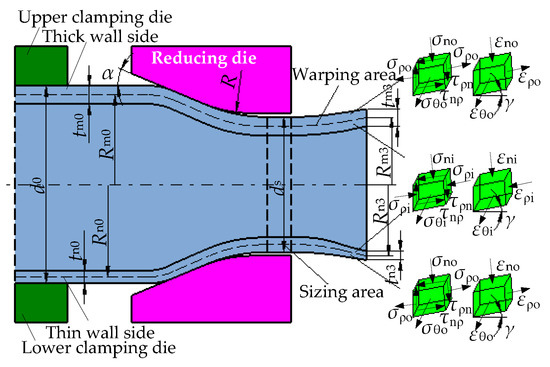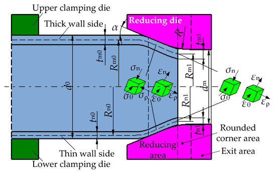 During the PDR, the upper and lower clamping die is used to fix the middle area of the tube, and the reducing die is reduced from the tube’s end to the inner side. The cavity of the reducing die is divided into the reducing area, the rounded corner area and the exit area, as shown in Figure 6. Based on the deformation characteristics in each area of the reducing die, the PDR deformation process can be divided into reducing stage, bending stage and warping stage. The mechanical model of the PDR tube with a wall thickness deviation is established, the upper and lower sides of the tube are defined as the thick and thin wall side, respectively. For the reducing die, the half-cone angle is α, the inner diameter of the exit area is dm and the rounded corner radius is R. For the initial tube, the diameter is d0, the intermediate layer radius of the thick and thin wall side is Rm0 and Rn0, respectively, and the corresponding wall thickness is tm0 and tn0, respectively.