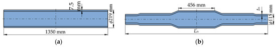 The hot-rolled seamless steel tube Q345B is selected as the initial tube with the length L0 of 1350 mm, the outer diameter d0 of 219 mm and the nominal wall thickness of 7.5 mm. According to the GB/T8162-2018 [23], the maximum allowable wall thickness deviation is 2.25 mm, so the critical relative unevenness Kc is 1.10%. During diameter-reducing, the middle area of the tube is clamped by clamping die, which is to keep the length of 456 mm without deformation, as shown in Figure 11. Moreover, the radius of upper and lower clamping die is 109.5 mm.