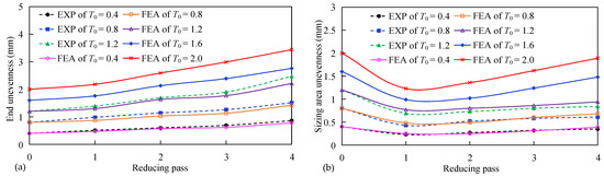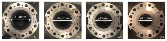 The initial unevenness T0 of 0.4 mm, 0.8 mm and 1.2 mm was selected, respectively. Four-pass PDR was carried out on the THP63-200/300/100 × 2 hydraulic press. The reducing die of each pass is shown in Figure 12, the half-cone angle α is 23°, the rounded corner radius R is 50 mm and the inner diameter of the exit area dm is 190 mm, 162 mm, 138 mm and 115 mm, respectively.