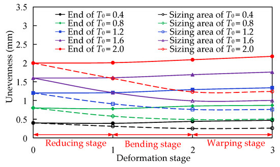 The tube end is warped in the warping stage, which results in the end diameter expansion and wall thickness thinning. Due to the σθn is greater than the σθm, the circumferential deformation and thinning of the thin wall side is larger than that of the thick wall side, which results in the end unevenness is further increased. When the relative unevenness exceeds the critical value, circumferential wrinkling will be generated. However, the inner side of the end is no longer warped, the unevenness is no longer changed as well, and the sizing area is formed. The outer diameter of the sizing area is less than the inner diameter of the exit area of the reducing die.