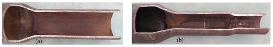 According to the Equation (10), the circumferential residual stress σθ in the end warping area is related to end warping deformation parameters and shear stress τρn. Since the direction of the τρn is upward, the σθ is characterized as tensile stress from the inner to outer surface and the σθ is verified as tensile stress by the X-ray measurement and FEA in the literature [15]. Moreover, the σθn of the thin wall side is greater than the σθm of the thick wall side. When the circumferential residual tensile stress of the end is greater than the ultimate tensile strength, axial cracking may occur and the axial cracking is more likely occur on the thin wall side.