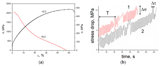 Stress–strain curve σ(ε) and work-hardening coefficient θ(ε) of Ni samples (a); example of stress drop as a function of time for Sections 1 and 2 (b). The numbers of sections correspond to those from Figure 1a.