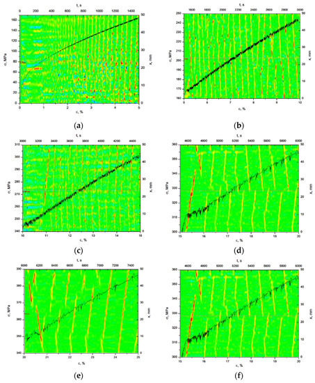 It is established that the emergence of PLC bands is associated with stress drops in the stress–strain curve. The kinetics of their formation and propagation in the successive sections of the stress–strain curve with an increase in total deformation to 5% is monitored based on the X-t diagrams shown in Figure 3. Here, the deformation time is postponed along the horizontal axis, and the coordinate of the PLC band along the extension axis corresponds to a vertical axis (a zero coordinate refers to a fixed gripper). At the gripping speed of 0.2 mm/min and at the first initial section below 5% (Figure 3a), the bands originate at a fixed gripper and move at a constant speed across the sample to the opposite edge, where they disappear (Figure 1a). Then, in Sections 2–6 (Figure 3b–e), with the further increase in total deformation to 5%, the process is repeated. At each moment of time, only one PLC band could exist in the deformable sample, however, moving towards either a mobile or stationary gripper of the testing machine.