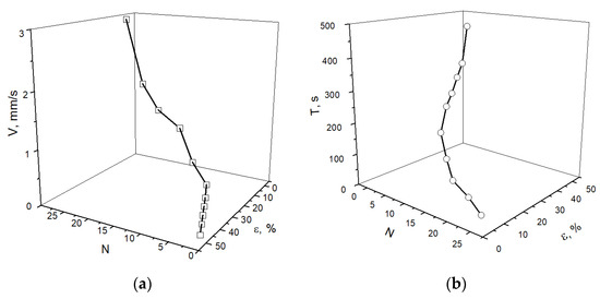 Synchronous recording of stress–strain curves and kinetic diagrams of the movement of PLC bands allows one to obtain their propagation velocity V, number N and time period T as the functions of the total deformation ε (Figure 4). The motion speed of PLC bands is calculated from the slope of the coordinate dependence on time in the above-presented X-t chronograms (Figure 3). The curve V(ε) of polycrystalline Ni, presented in Figure 5a, has an exponential form, which indicates the difference in the relationships between the propagation speed of PLC bands and the deformation in the corresponding plastic strain stages. The dependence of the number of PLC bands on the total deformation N(ε) of the sample is also described by the exponential function. As can be seen from Figure 4, with an increase in total deformation, there is a decrease in the number of PLC bands and their speed of movement along the sample, while the period T between the PLC bands increases. With a minimum total deformation (beyond the yield point), the propagation velocity of these bands achieves their maxima and then decreases with increasing deformation, arriving at the minimum values at fracture of the specimen.