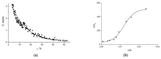 Since the absolute values of the speeds of PLC strips are related to the strain rate, a comparison of the speeds allows one to enter the relative velocity of movement of the band as Vrel = V/V0, where V is the absolute velocity of the PLC band, and V0 is the velocity of motion of the mobile gripper of the testing machine. The difference between the velocity of the PLC bands in the load–unload mode (with an increase in total deformation to 5%) and the velocity of motion of the mobile gripper is found to be ~101–103 times. Furthermore, normalizing the dependence of the relative velocity of the PLC bands on the work-hardening coefficient θ (Figure 2a) by the shear modulus G results in a sigmoidal plot (Figure 5b) with a correlation coefficient R = 0.98, descending with a decrease in the parameter θ.
