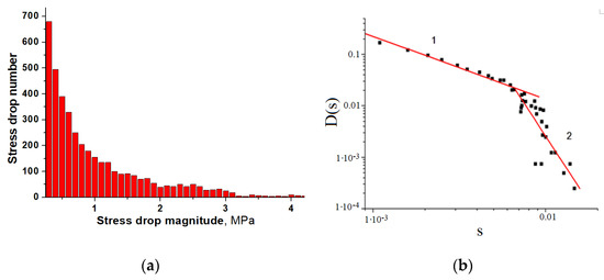(a) Statistical distribution of the number of stress drops; (b) statistical distribution function D(S) of the normalized stress drop amplitudes in double logarithmic coordinates.