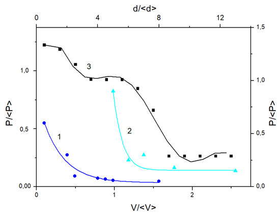 Given the results of Refs. [46,47,48,49,50], it can be argued that scaling of relaxation structural parameters is a common feature of deformable crystalline materials, regardless of the deformation conditions and the material itself. The cells are located both inside and outside the MBs, and the micrograins are mainly concentrated at the MBs. The normalized distribution curves of the rolled Ni cell sizes, adopted from Ref. [46], are shown in Figure 7 (Curve 1). At the same time, adding the normalized sizes of micrograins concentrated at the MBs to the statistical dependence of the cell sizes leads to another dependence plotted in Figure 7 (Curve 2). To analyze the morphological invariance of band structures (Figure 7), observed at different scale levels, the distribution of macroscopic PLC bands by their propagation velocities V in Ni alloy under uniaxial tensile (Curve 3) was constructed by analogy with Curves 1 and 2, where P(V) = (1/<V>)·P(V/<V>) is the probability normalized by the average velocity value <V> [46]. As can be seen from Figure 7, all three distribution curves associated with various types of strain-induced structural formation differ significantly from each other.