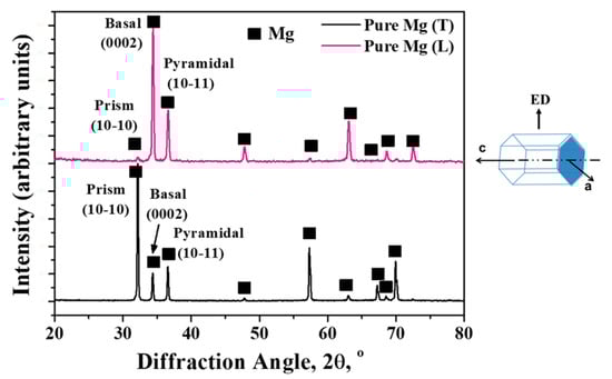 X-ray diffraction (XRD) analyses on the polished samples from extruded rods were performed using an automated Shimadzu LAB-XRD-6000 X-ray diffractometer (Shimadzu, Columbia, SC, USA) (Cu, Kα = 1.54056 Ǻ), with a scanning speed of 2°/min. Phase identification was carried out by matching the Bragg angle and the intensity of the peaks with the standard peaks of Mg, Fe, and other related phases. X-ray measurements were conducted on extruded samples, both in the transverse (i.e., sample cross-sectioned direction) and longitudinal directions to obtain information on bulk texture (i.e., crystallographic orientation) of Mg matrix.
