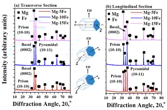 X-ray diffraction patterns of Mg-Fe composites along (a) transverse and (b) longitudinal sections.