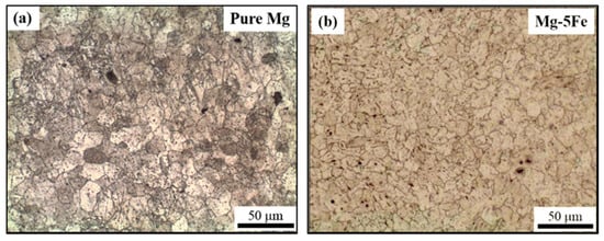 The measured grain size values of the test materials are given in Table 1. By the addition of Fe to Mg, the grain size decreased. As an example, the average grain size of Mg-5Fe decreased by >50% when compared to pure Mg (Figure 3). Grain refinement is due to Fe particles that act as obstacles and hinder grain growth via restricting the migration of grain boundaries during hot extrusion. The average grain size increases with increasing Fe content but still remains smaller than that of pure Mg.