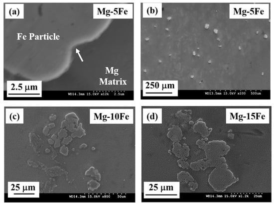 SEM micrographs: (a) clear interface in Mg-5Fe (shown by the arrow). No interfacial reaction products at interface. Distribution of Fe particles in Mg-matrix: (b) Mg-5Fe; (c) Mg-10Fe; and (d) Mg-15Fe.
