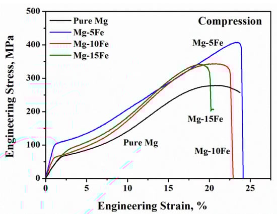 The compressive strength properties of pure Mg and Mg-Fe composites are given in Table 4. Engineering stress–strain curves of pure Mg and Mg-Fe composites under compressive loading are shown in Figure 6. All Mg-Fe composites have a higher compressive yield strength (CYS) and a higher ultimate compressive strength (CTS) than pure Mg, which is due to the presence of Fe particles. The compressive strength properties of Mg-Fe composites in comparison to those of pure Mg were such that (i) for Mg-5Fe, the yield strength and ultimate strength increased by 53% and 32%, respectively; (ii) for Mg-10Fe, the yield strength and ultimate strength increased by 23% and 5.5%, respectively; and (iii) for Mg-15Fe, the yield strength increased by 12%, and the ultimate compressive strength was retained. The compressive ductility of Mg-5Fe increased slightly by 4%, whereas for Mg-10Fe and Mg-15Fe, the compressive ductility decreased by 11% and 22%, respectively. Amongst the Mg-Fe composites, the Mg-5Fe composite displayed the highest compressive properties. As seen from Figure 6, for all the materials, the engineering stress–strain curves have a sigmoidal shape with an initial upward concave profile (after their yield points) and a subsequent convex profile. As opposed to under tension, significant work hardening under compression in extruded Mg materials is due to deformation by twinning [,]. Furthermore, the activation of non-basal slip systems also contributes to work hardening [], and as a result, the overall compressive strength (with large strains) increases.